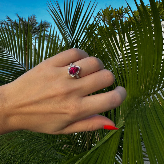 Shop our luxury spinel fine jewellery in 18k gold, our signature red spinel and diamond ring.