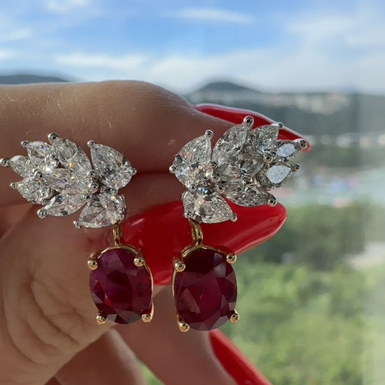 A statement two way earring, handcrafted with certified “Pigeon Blood” oval cut rubies from Burma, the most sought-after ruby origin in the world. With their vivid, glowing red hue, these stones possess an inner fire that only Burmese rubies can deliver, legendary gems prized for generations for their rarity and unmistakable intensity.